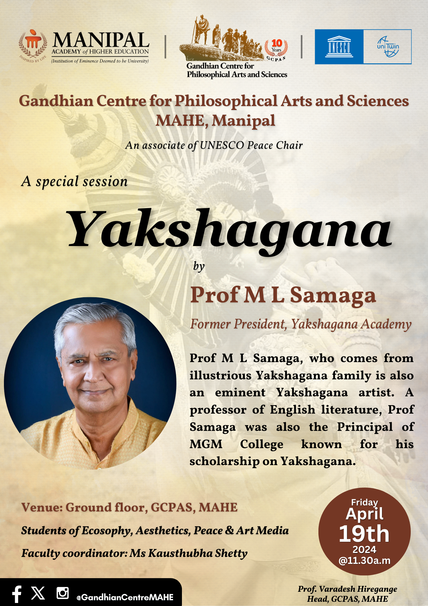 Prof M L Samaga, who comes from an illustrious Yakshagana family is also an eminent Yakshagana artist. A professor of English literature, Prof Samaga was also the Principal of MGM College known for his scholarship on Yakshagana.
