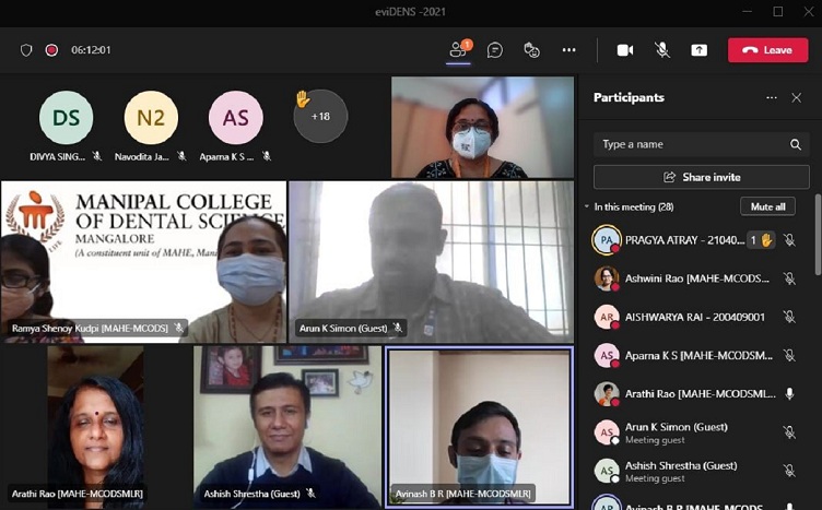 A Workshop on Research Methodology, Epidemiology, Biostatistics and Ethics titled - “eviDENS – 2021” was organized by the Department of Public Health Dentistry, Manipal College of Dental Sciences, Mangalore on 13th – 14th December 2021. The target audience for the program was the first year post graduate students. A total of 48 participants participated in the program, which included post graduate students and faculty members from MCODS, Mangalore and Manipal and other dental colleges of India. The workshop was held on online platform Microsoft Teams. The Karnataka State Dental Council has credited 13 points to this CDE Program.