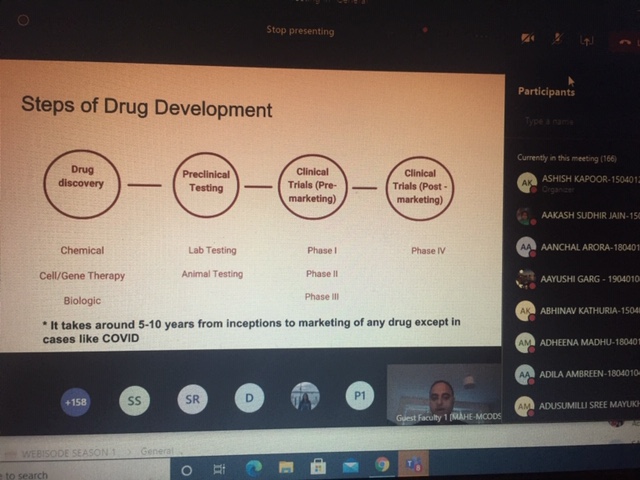 On 1st September, MAHESRF conducted the Season 1 , Episode 2 of the series called WEBISODES. It was a webinar titled-“Insights into Clinical Research” by Dr.Sorabh Kapoor . It was open to students from all the years. With the support of the Dean, Associate Deans, Head of the departments , Staff members and Staff mentors- it was conducted successfully on Microsoft Teams. The event started at 12:15 pm and was attended by approximately 170 participants. Having an experience of more than 19 years in the field of Healthcare which includes an experience of more than 14 years in Clinical research operations, Sir is working as a Senior Startup Critical Path Manager in Ireland. Currently sir is working on the multiple Covid Clinical trials. Sir very systematically and patiently explained the flowchart of the various steps involved in the Research trial and how a drug is released in the market. Each and every step was elaborated and very well explained to ensure that the participants understand it very well. Sir even highlighted about the process to conduct trials during pandemic situations to meet the emergency demands. This was followed by the Q&A session in which students were free to ask questions/doubts. Sir very patiently answered all the questions and made sure that none of the participants had any query unanswered. The welcome address was given by Debolina Bishayi, Joint Secretary -MAHESRF and the event was moderated by Dr Aakash Jain-Secretary , MAHESRF. The event got over by 2:00 pm and the participants were satisfied and had positive reviews for the event.
