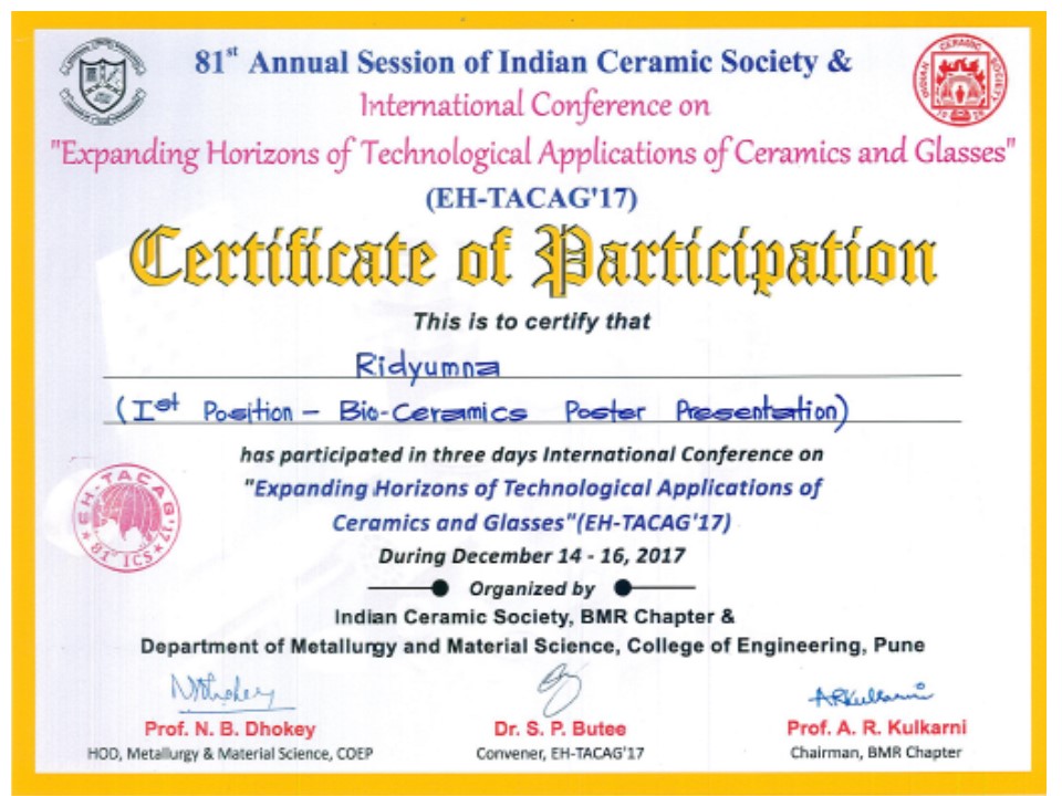 Congratulations to our intern Dr Ridyumna Garain who has won the best poster award at International conference on " Expanding horizons of technological applications of Ceramics and glasses" held at Pune. It is a matter of pride that he competed with M Tech and PhD students and won this award . He was greatly appreciated by the judges of the competition.