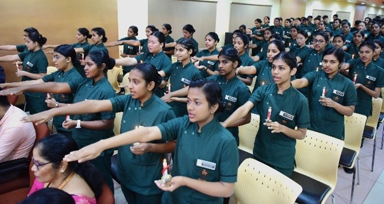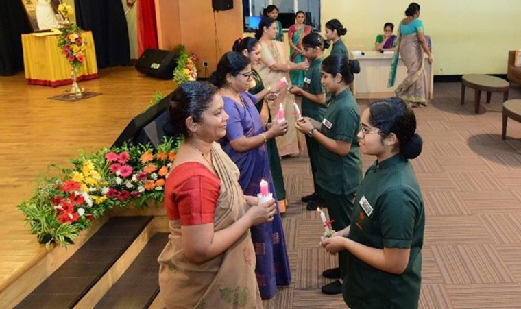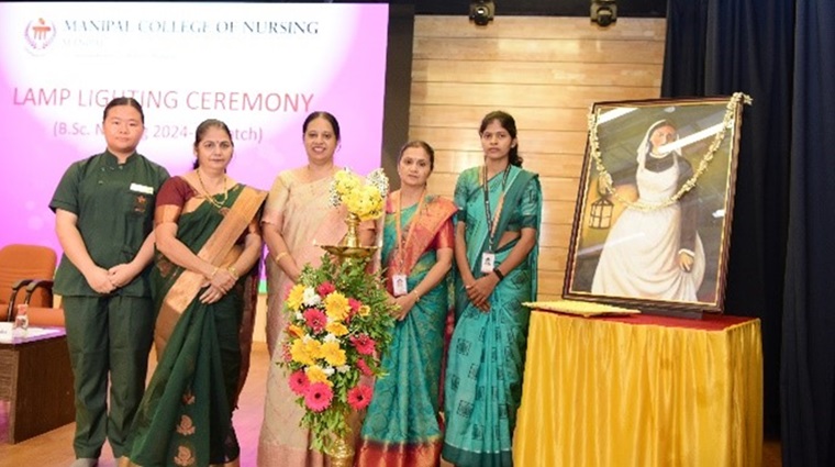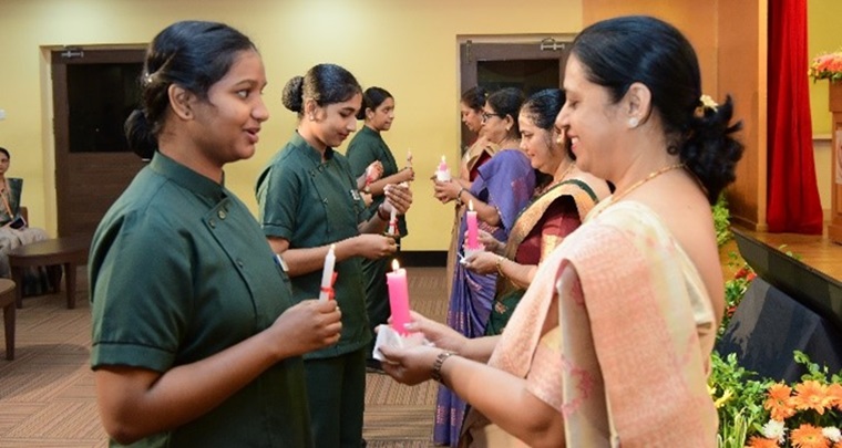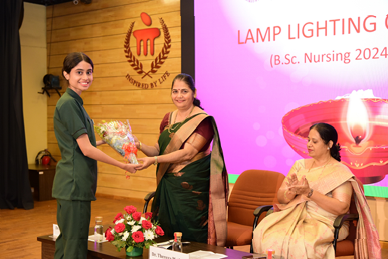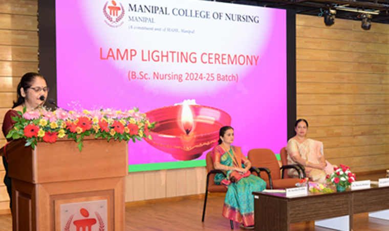 The lamp lighting ceremony for the 36th batch of BSc Nursing students at the Manipal College of Nursing (MCON) was held on October 15, 2024, with great enthusiasm and reverence. This significant event, symbolizing the students' formal entry into the nursing profession, was graced by the presence of esteemed guests, faculty members, students, and their families. The program commenced with a warm welcome by Dr. Savitha P., class coordinator, followed by a soulful invocation song led by Ms. Denna and her group, seeking divine blessings for the occasion. The dignitaries, including the Chief Guest, Dr. Thereza Mathias, Professor and HOD at Laxmi Memorial College of Nursing, Mangalore, were invited to the dais. Dr. Judith A. Noronha, Dean of MCON, and other distinguished guests were also present. In her inspiring address, Dr. Mathias emphasized the importance of nursing and the dedication essential for success in the profession.