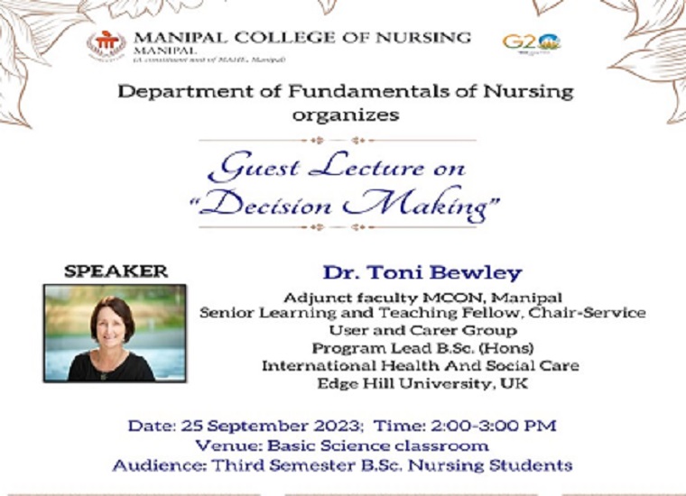 Dr. Toni Bewley, the Adjunct Faculty of MCON and Senior Teaching Fellow and Program Lead, School of Nursing, EdgeHill UK, deliberated a session on "Decision Making" to 3rd semester BSc Nursing students on 25.09.2022 between 2.00 and 3.00 pm. She explained the topic by incorporating relevant clinical scenarios to enhance the decision-making ability of the students. She further discussed the professionalism and code of conduct requirement for the nurses to enhance early patient care decision-making. She also said good practice guidelines and holism in patient care boost clinical nursing practice.