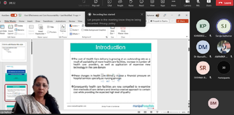 Department of Child Health Nursing, Manipal College of Nursing (MCON), Manipal Academy of Higher Education, Manipal organized an alumni guest lecture on “Cost Effectiveness and Cost Accounting in Nursing Service Administration” on April 17, 2023, between 02.00 pm & 03.00 pm for postgraduate nursing students through Microsoft Team Platform. Mrs. Saroja Jaykumar, Nurse Manager, Manipal Health Enterprises Limited (MHE). (MSc Graduate 1998-2000 batch) of MCON, Manipal was the speaker for the session. She discussed the various aspects of Cost Effectiveness and Cost Accounting in Nursing Service Administration including the types and the process of cost management in the nursing service department. She also emphasized the importance of nurses’ involvement in Cost management planning, which facilitates the empowerment of nurses in financial planning and management. Mrs. Saroja Jaykumar shared her experience of Cost management and emphasized the need for sound clinical experience for nurse administrators.