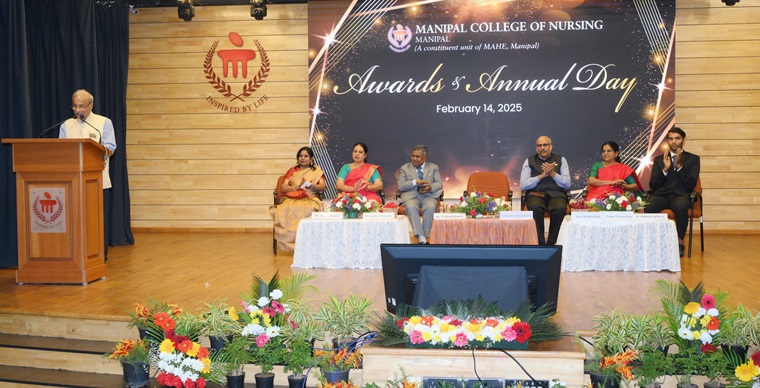 “In the future era of specialization, there is an increasing need for specialized nursing. Manipal has truly reached the length and breadth of the world with its excellence" said the Chief Guest of the day, Dr. T Dileep Kumar, President, Indian Nursing Council, New Delhi, during the 35th Awards and Annual Day of Manipal College of Nursing (MCON), Manipal Academy of Higher Education (MAHE), Manipal, held on 14 February 2025, at Dr TMA Pai Auditorium, MAHE, Manipal. He also emphasized the importance of a nurse in the health care delivery system and called for investing money in nursing, creation of nursing positions, interprofessional leadership and enhancing service delivery.