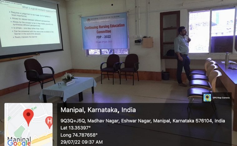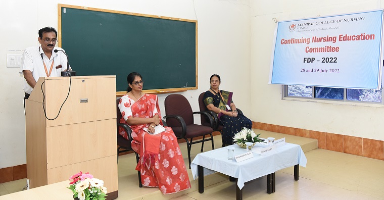 The Continuing Nursing Education committee of Manipal College of Nursing, MAHE, Manipal, organized Faculty Development Program (FDP) on July 28 & 29, 2022. The Chief Guest for the inaugural session Dr. Sathish Rao, Director, Directorate of Research, MAHE appreciated the efforts taken by the institution to be one among the top Nursing Institutions in India & congratulated Dean and her team for successfully holding FDP. He said organizing FDP would strengthen the knowledge and skills of faculty members and will prepare them to take up challenges.