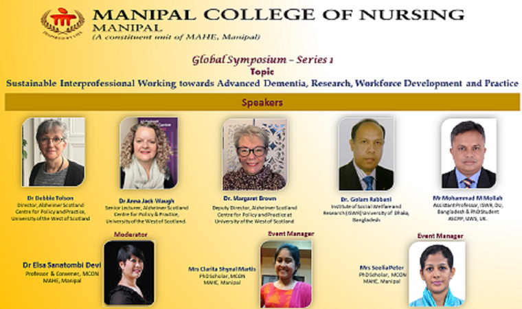 The first Global Symposium series flagged off with the subtheme “Sustainable Interprofessional working towards Advanced Dementia, research, workforce development and practice” by Prof Debbie Tolson, Director Alzheimer’s Scotland, Dr Margaret Brown, Deputy Director Alzheimer’s Scotland, Dr Anna Jack-Waugh, Senior Lecturer, Alzheimer Scotland Centre for Policy & Practice, the University of the West of Scotland. They laid their emphasis on evidence-practice policy in the current scenario and practical dementia care. Prof Golam Rabbani and Mr Mohammad M Mollah of Social Welfare and Research (ISWR) University of Dhaka, Bangladesh shared their unique experiences of dealing with education, practice and policy in dementia care in Bangladesh. Dr Elsa Sanatobi Devi moderated the session. The program closure remarks and acknowledgement for the inaugural and subsequent sessions were delivered by Dr Shashidhara YN, Prof & Head, Department of Community Health Nursing, MCON, MAHE, Manipal