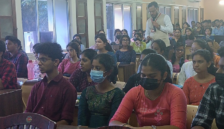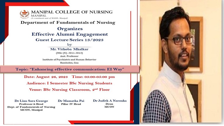 The Department of Fundamentals of Nursing conducted effective alumni engagement, guest lecture series 13/2023 at 3 PM on August 26, 2023, for the First Semester BSc nursing students. Mr. Vithoba Mhalkar, Asst. Professor, Institute of Psychiatric and Human Behavior at Bambolim, Goa, and Alumnus of MCON from the MSc nursing batch 2011- 2013, took a session on Enhancing Effective Communication: Emotional Intelligence (EI) Way.