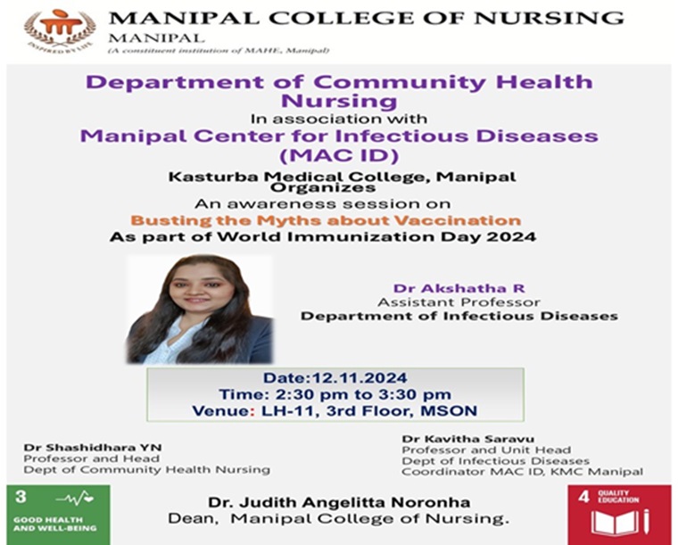 As part of World Immunization Day 2024, the Department of Community Health Nursing, MCON, in association with the Manipal Centre for Infectious Diseases Kasturba Medical College, Manipal, organised an awareness session on ‘Busting the myths about vaccination’ on November 12, 2024, at 2.30 pm.