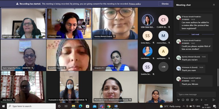 Manipal College of Nursing, Manipal Academy of Higher Education, Manipal, organized the INDO - UK workshop on Systematic Review and Meta-analysis through the virtual mode from 22 November 2021 to 26 November 2021. This workshop was supported by the financial grants from SPARC & UKEIRI SPARC support programme.