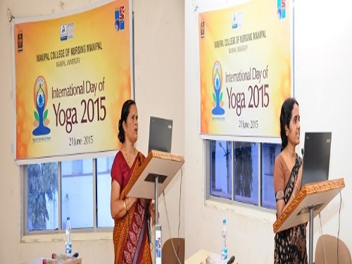Dr.Manjari Chandra, ex-student of Yoga therapy, KMC Manipal had demonstrated various yoga aasanas. Students and faculty of MCON and MSON joined her and performed various aasanas. The various aasanas demonstrated were: Trikonasana, Parshwakonasana, Parshwottanasana, Padahastasana, Paschimatanasana, Janurshirshasana, Bhujangasana, Dhanurasana, Bharadwajasana, Ardhamatsyendrasana, Sarvangasana, Vrikshasana, Baddakonasana, Anuloma Viloma Pranayama, Makarasana and Shavasana.