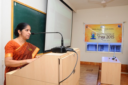 Session on various topics related to Yoga was conducted on 20th June 2015 from 2:00 pm to 4:00 pm. Dr.Annapoorna Acharya, Selection Grade Lecturer, Yoga Department, KMC, Manipal gave a holistic view of Yoga. She said Yoga is not just an exercise; it is a practice which needs to be continued with balanced mind and body. She said it is important to follow a good diet and lifestyle practices along with yoga.