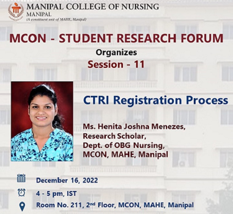 Manipal College of Nursing - Student Research Forum, MAHE, Manipal, organized the eleventh session of the year-long lecture series on ‘CTRI Registration Process’ on 16 December 2022, from 4.00 pm to 5.00 pm. The Resource Person for the session was Ms. Henita Joshna Menezes, Research Scholar, Department of Obstetric and Gynecological Nursing, Manipal College of Nursing, MAHE, Manipal.