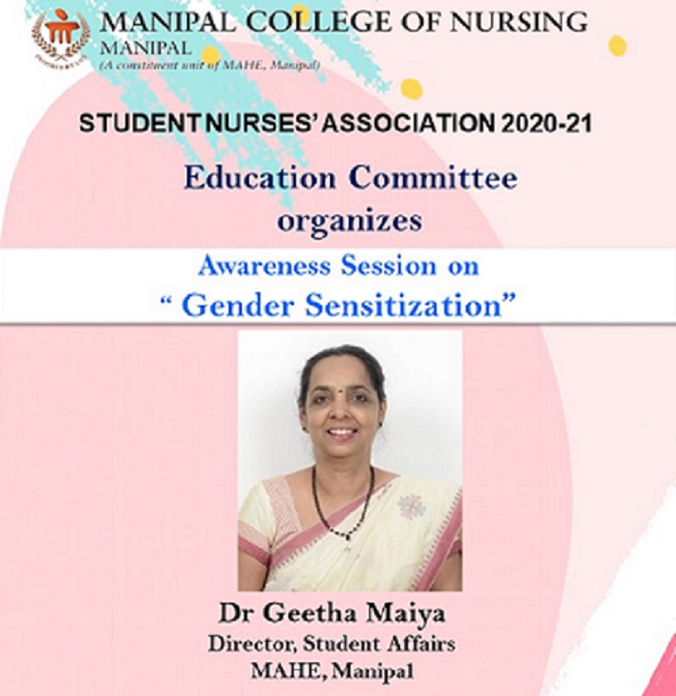 The Education Committee of Student Nurses’ Association 2020 -21 of Manipal College of Nursing Manipal has organized an awareness session on the topic “Gender Sensitization” on 12th February 2021 between 5:00 pm & 6:00 pm.  Dr Geetha Maiya, Director-Student Affairs, MAHE, Manipal was the resource persons for the session. She spoke about gender, gender equality and inequality, problems of gender inequality, major reasons for gender discrimination, sexual harassment at workplace, sexual harassment prevention training etc. She also highlighted about what MAHE is doing towards gender discrimination, gender champion workshop and also about the Internal Complaints Committee of MAHE, Manipal.