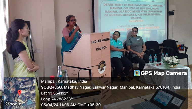 A continuing nursing education programme was organized on the topic “Clinical skills and practices” by the 2nd year MSc Nursing students of Manipal College of Nursing, Manipal Academy of Higher Education, Manipal, in association with the Department of Nursing Services, Kasturba Hospital, Manipal, on April 5, 2024. Dr. Jyothi Chakrabarty, Professor and Head of the Department of Medical-Surgical Nursing, presented the inaugural address. Sr. Punitha and Ms. Leena Chetry, students of 2nd year MSc Nursing, deliberated on the session on “Basic ECG Interpretation.”. The next session on “Titration of Sedatives” was deliberated by Dr. Souvik Chaudhuri, Associate Professor, from the Department of Critical Care Medicine, Kasturba Medical College, MAHE, Manipal.