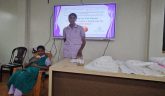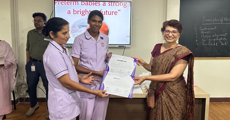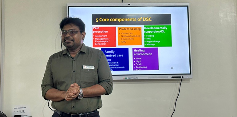 Dr. Sheila Samanta Mathai, Professor & Head, Department of Neonatology, KMC, Manipal, provided a brief overview of the program and highlighted the importance of the theme. An interactive question and answer session was organized for the semester V BSc Nursing students, MSc Nursing students of MCON, MAHE, Manipal, and staff nurses from the neonatal, antenatal, and postnatal units of Kasturba Hospital, Manipal, to strengthen their knowledge of essential newborn care practices. Dr. Subhodh Shetty, Associate Professor, Department of Neonatology, KMC, Manipal, was the resource person. A total of 20 students and 26 staff nurses demonstrated enthusiasm and actively participated in the discussion. Following this, a comprehensive newborn care workshop on the theme was conducted by the team of staff nurses. The nurses demonstrated key newborn care practices to enhance their knowledge and practical skills related to newborn care. The first session focused on Developmental Supportive Care, with its components of Kangaroo Mother Care and nesting, demonstrated by Ms. Pramila, Ms Rakshitha, Ms Dakshayini, and Ms Anushka. The second session was aseptic non-touch technique (ANTT) by Ms Sudharshini, Ms. Chaithanya, and Ms, Ann Mary. They demonstrated the proper techniques for hand washing, intravenous hub management, and preparation of intravenous fluids and total parenteral nutrition under laminar airflow (LAF) conditions. The last session of the workshop focused on assessment and the positions of breastfeeding, paladai, and katori feeding by Ms. Shashikala, Ms Ashwini, and Ms Susanna.