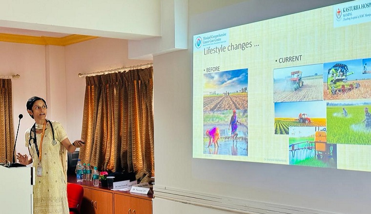 The speakers for the seminar were Dr. Sharada Mailankody, Associate Professor, Department of Medical Oncology, Dr. Naveena AN, HOD and Professor Department of Surgical Oncology, KH, KMC, MAHE and Ms. Anamika Das, II Year MSc Nursing student, Oncology Specialty. Dr. Sharada was the first speaker of the day and she spoke on Lifestyles associated with common cancers. Dr. Naveena was the second speaker and he delivered his lecture on Common Male Cancers affecting the male population. The last speaker for the day was Ms. Anamika who stressed on early recognition of cancer and its preventive strategies.