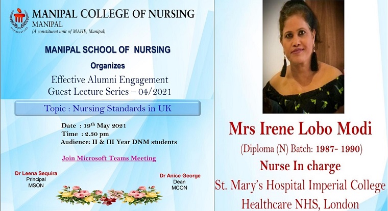 Manipal School of Nursing, MCON, MAHE, Manipal had organized a guest lecture on the topic “Nursing Standards in UK” by Mrs Irene Lobo Modi on 19 May 2021 at 2.30 pm on MS Teams platform.