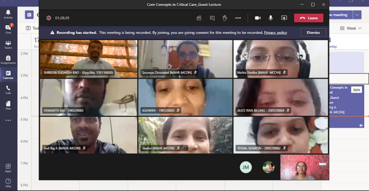 The department of Medical-Surgical Nursing, Manipal College of Nursing, MAHE, Manipal organised a guest lecture on “Core Concepts in Critical Care” on 23rd January 2021 between 4 pm and 5 pm. The guest lecture was delivered by Dr Sudhesh Rao, Consultant Intensivist and Head department of Critical Care, A.J Hospital, Mangaluru to “Nurse Practitioner in Critical Care (NPCC)” students through Microsoft Teams Platform. He elaborated on the history of critical care in India, the types of intensive care units, multidisciplinary and collaborative approach, team dynamics and communication, models of care and classification of critically ill patients. He urged students to have passion in critical care and to be leaders as they belong to the first few batches of the program in India. A total of 12 participants including first year and second year NPCC students and faculty members of the college participated in the session.