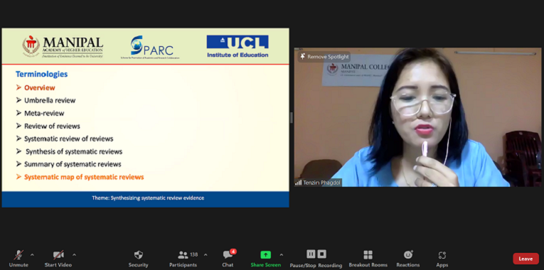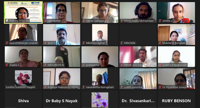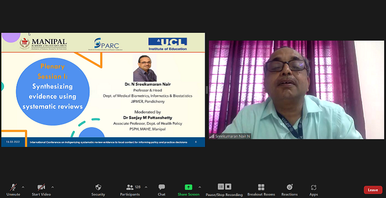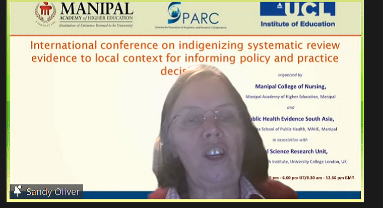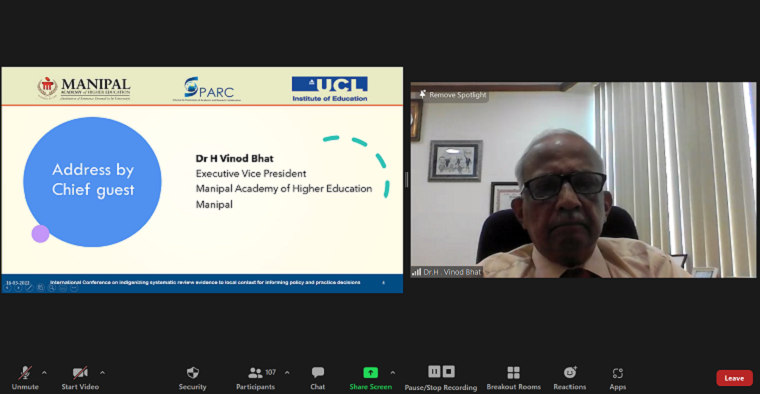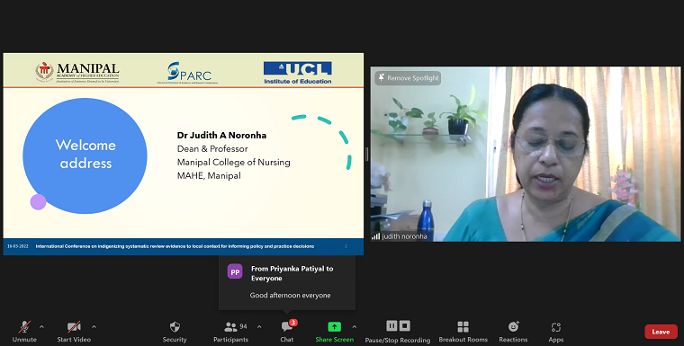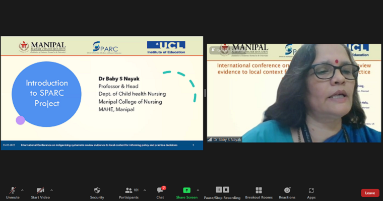 SPARC funded International conference (virtual) on ‘Indigenizing systematic review evidence to local context for informing policy and practice decisions’ was organised by MCON, MAHE, Manipal and PHESA, PSPH, MAHE, Manipal in association with Social Science Research Unit, UCL Social Research Institute, UCL, UK was held on 16th and 17th March 2022 at 2:00 - 6:00 pm IST/8:30 - 12.30 pm GMT. On 16th March, at 2.00 pm the conference began with the formal inauguration. Dr Judith A Noronha, Dean, MCON, MAHE welcomed everyone, detailed introduction to the SPARC project was given by Dr Baby S Nayak, Prof. & Head, Dept of Child Health Nursing, MCON, MAHE, Manipal. Dr H. Vinod Bhat, Executive Vice President, MAHE, Manipal was the chief guest. In the chief guest address, Dr H. Vinod Bhat explained the difficulties in obtaining a SPARC grant for MAHE being a private university. He also discussed the importance of a strong evidence base for any health policies. A vote of thanks was delivered by Dr Binil, Associate Professor, Dept. of MHN, MCON, MAHE, Manipal, who was the convenor of the conference.
