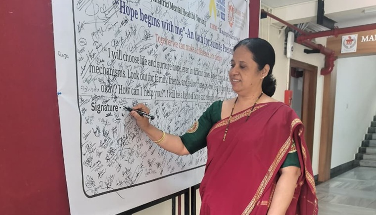 The events commenced early in the morning with the “Hope begins with me: An Oath for Suicide Prevention” campaign at the MCON ground floor with the active participation of final year postgraduate students of Psychiatric Mental Health Nursing. A large banner carrying the oath text was displayed, inviting students, faculty, and staff to pledge their commitment towards preventing suicide and promoting mental health. Hundreds of participants signed the pledge, symbolizing their solidarity in rejecting stigma, supporting peers, and spreading hope. The banner, now filled with signatures, stood as a testament to collective responsibility in suicide prevention. Photographs captured students and faculty members enthusiastically signing the banner, reflecting both awareness and commitment.