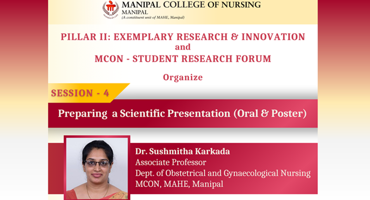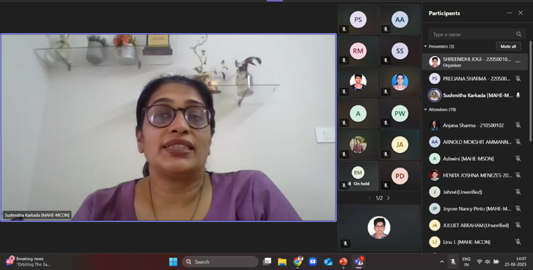 Pillar II Exemplary Research and Innovation, in collaboration with the Student Research Forum of Manipal College of Nursing, MAHE, Manipal, conducted an online session titled “Preparing a Scientific Presentation (Oral & Poster)” on 25th June 2025. The session held from 2:00 p.m. to 3:00 p.m. was led by Dr. Sushmitha Karkada, Associate Professor, Manipal College of Nursing, MAHE, Manipal. She provided an in-depth overview of the essential components of crafting and delivering effective oral and poster scientific presentations.