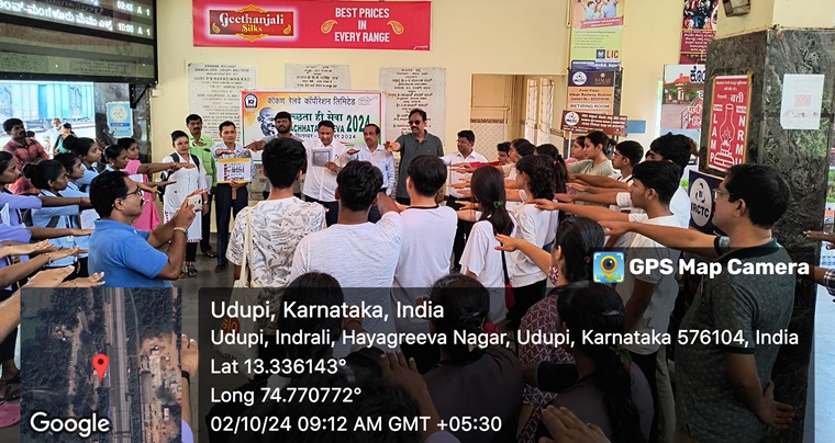 The Department of Community Health Nursing, National Service Scheme (NSS) & Volunteer Services Organization (VSO) Units of Manipal College of Nursing (MCON), in collaboration with the Health Unit of Konkan Railway Corporation Ltd, organised a Swachh Bharath Abhiyan awareness program on 2nd October 2024, as part of the Swachhatha Hi Seva 2024 initiative. The event took place at the railway station in Udupi. The program kicked off with an inaugural ceremony graced by the esteemed presence of Dr. Shenoy, the President of the Indian Medical Association (IMA) Udupi Chapter. The Deputy Chief Medical Officer, Dr. Steven George, led the volunteers to take the Swachh Bharat pledge. A rally featuring impactful slogans on sanitation was conducted, creating awareness among the public. The volunteers distributed pamphlets to residences and shops during their house visits, sensitizing the community on the significance of maintaining a clean environment. The initiative was well received by all participants and garnered appreciation for its efforts towards promoting cleanliness and hygiene in the community. This collaborative programme is aligned with Sustainable Development Goal 3 (Good Health and Well-being), 6 (clean water and sanitation), and 17 (partnership for the goals), as it serves to raise awareness about health and hygiene practices among the public, contributing to a healthier and cleaner environment for all.