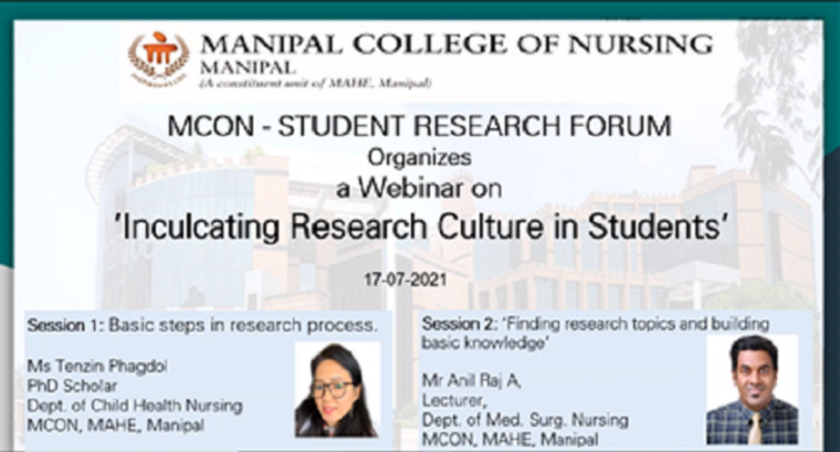The Student Research Forum of Manipal College of Nursing (MCON), MAHE, Manipal organized a webinar on “Inculcating Research Culture in Students”. The first two sessions of the year-long webinar series were held on 17 July 2021 from 3.00 pm to 5.00 pm. The target audience were the undergraduate & postgraduate students, PhD Scholars, and Project Staff of MCON, MAHE, Manipal. Dr Binil V, Associate Professor, Department of Psychiatric (Mental Health) Nursing, MCON, and Faculty Advisor of SRF-MCON addressed the participants and briefed the objectives of SRF-MCON. He also spoke on the importance of the webinar series. Ms. Tenzin Phagdol, PhD. Scholar, Department of Child Health Nursing, MCON, Manipal discussed the basic steps in a research process and Mr Anil Raj A, Lecturer, Department of Medical-Surgical Nursing, MCON, Manipal took a session on finding research topics and building basic knowledge. Both the sessions were interesting and were highly appreciated by the participants. A total of 90 participants attended the webinar sessions. E-certificate was given to the participants.
