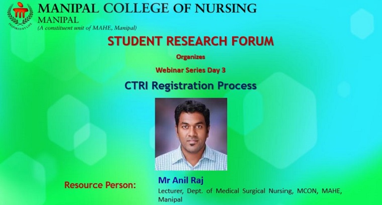 The third session of the webinar series was held on 2 January 2021. Mr Anil Raj A, Lecturer, Department of Medical-Surgical Nursing, MCON, Manipal was the resource person. He deliberated on the topic “CTRI Registration”. Ms Suveksha Giri, I year MSc Nursing student was the moderator for the session. Various questions pertaining to the CTRI application and approval were asked by the participants to the resource person during the question-and-answer session. The resource person clarified all the doubts of the participants. A total of 32 students attended the session, which included faculty members, PhD Scholars, undergraduates, postgraduates and the MPhil Nursing students.