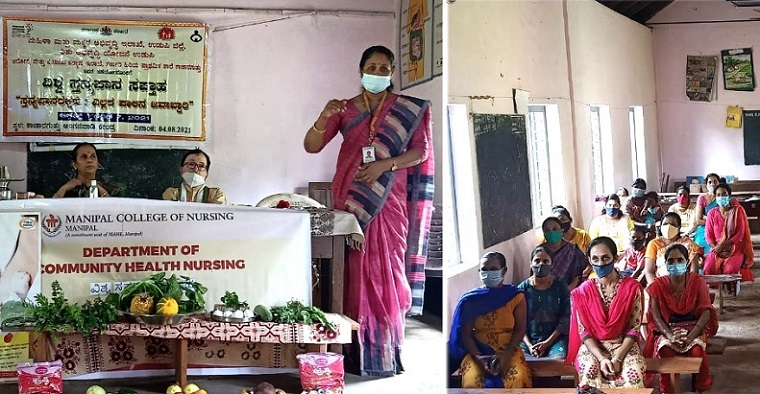 Dr Ansuya Bengre, Assistant Professor, Department of Community Health Nursing, MCON, MAHE, delivered a comprehensive talk on the importance and benefits of breastfeeding, the composition of breast milk and various positions and attachment while feeding, benefits of breastfeeding for the mother and the child, continue successive breastfeeding, stressing on feeding even while travelling and in public area and also advised not to give pre-lacteal feeding. The program also highlighted covid safety measures to be followed when the infection is suspected in the family. The importance and consequence of covid vaccines were also explained. This was followed by a talk and demonstration regarding positioning the baby, techniques of breastfeeding, expression of breast milk and the management of breast conditions. The programme was attended by 25 mothers, Self-help group women, Anganwadi workers and ASHA workers.