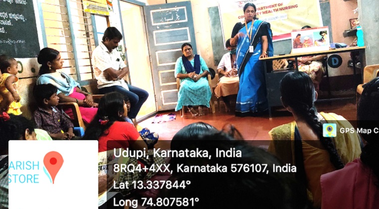 To sensitize on breastfeeding and nutrition issues in the community, the Department of Community Health Nursing, MCON, Manipal, and Women Child Development Department, Udupi jointly conducted an awareness programme on 4th August 2022 at 80 Badagubettu Anganawadi centre between 11.00 am and 12.00 pm. Dr. Ansuya, Assistant Professor, Dept. of Community Health Nursing gave a talk on the importance of breastfeeding, composition of breast milk, various positions, and attachment while feeding. She stressed the importance of giving breastfeeding even while traveling and to avoid giving prelacteal feeding and formulae feeding. Mrs. Akshatha Nayak, Community Health Officer (CHO), Wellness Center, Badagubettu has explained in detail the benefits of breastfeeding, and continued feeding. Mrs. Usha, President of Balavikas Samithi, Mr. Keshav Kotian, Gram Panchayath member emphasized to the audience to update their knowledge by attending these programmes and transform this information to the neighbours and in the community to minimize neonatal death and reduce malnutrition among children. The programme was attended by 20 antenatal and post-natal mothers and the mothers and caretakers of under-five children. Also, Mrs. Reshma Kotian, Mr. Rakesh Datta, Lecturer, MCON, one Anganwadi worker and one ASHA worker have participated in this programme.
