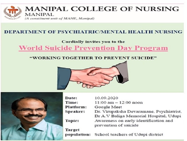 A webinar on “Early detection of the warning signs and prevention of suicide” was organised by the Department of Psychiatric/Mental Health Nursing, Manipal College of Nursing, Manipal on 10th September 2020 through the online Google Meet platform for the Primary and High School Teachers of Udupi District. Ninety-four teachers from 32 schools registered and attended the webinar geld between 11:00 am & 12:45 noon. Dr Virupaksha Devaramane, Consulting Psychiatrist, Dr A V Baliga Memorial Hospital, Udupi was the Resource Person for the webinar. Dr Virupaksha spoke on the warning signs especially among the students and the risk factors involved. During his talk, he stressed on the methods to deal with the sensitive issues faced by the students and youth. At the end of the session, an interactive session was held between the speaker and the participants.