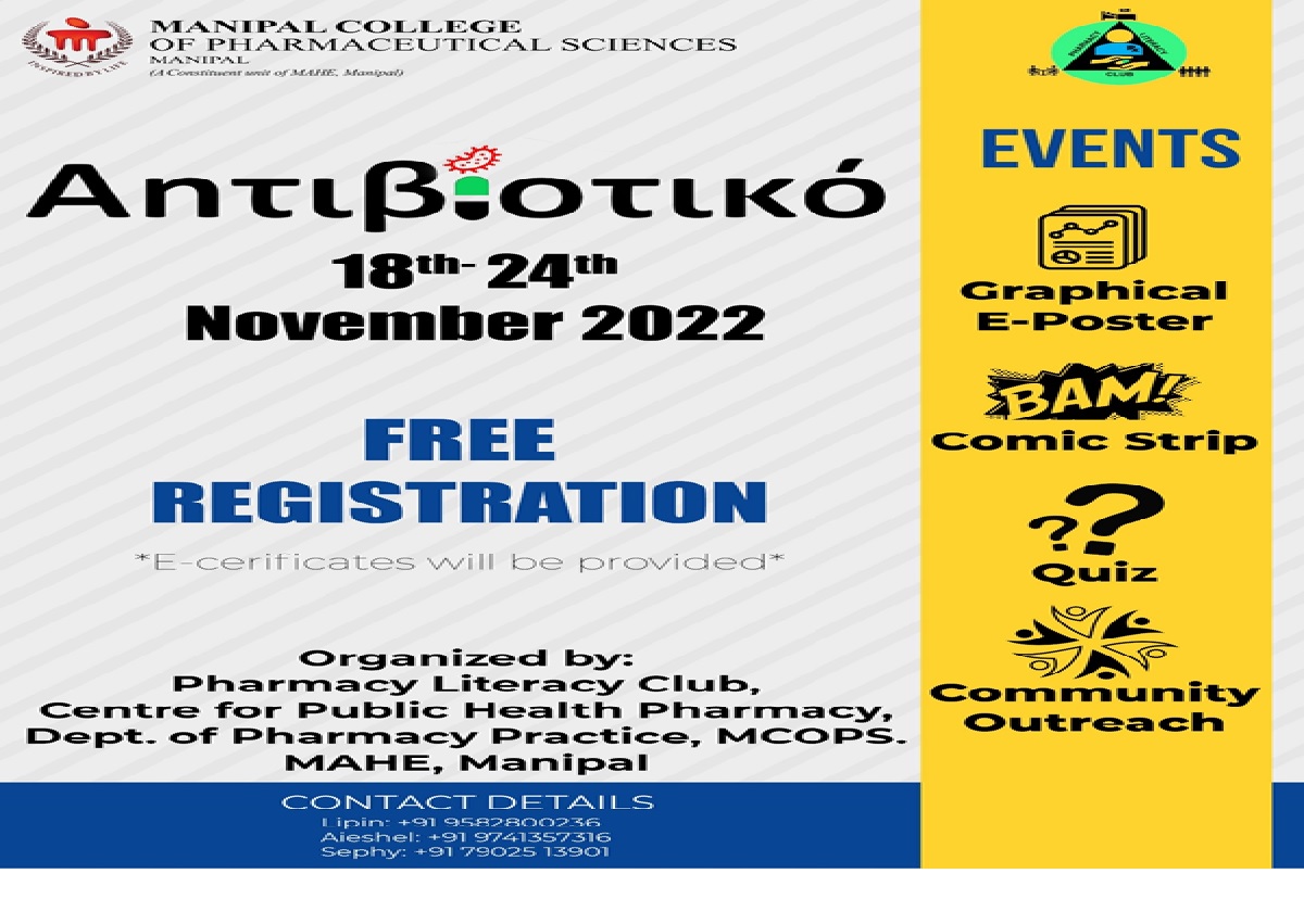 In addition, PLC also conducted a plethora of online competitions such as quizzes, comic strips, and poster presentations. In addition to students from Manipal Academy of Higher Education, students of various institutions including M S Ramaiah University of Applied Sciences, Bengaluru; Kampala International University, Uganda; Jawaharlal Nehru Technological University, Anantapur; Charotar University of Science and Technology, Changa, Gujarat; IQRAA International Hospital and Research Centre, Kozhikode; Geetanjali University, Udaipur; Dr. A.P.J. Abdul Kalam Technical University, Lucknow; Kavayitri Bahinabai Chaudhari North Maharashtra University, Jalgaon and Amrita Vishwa Vidyapeetham, Kochi also participated in the competitions. An offline quiz and puzzles solving competitions were also held on 22 November 2022 at the Department of Pharmacy Practice, MCOPS. Both staff and students participated in the fun-filled events with great enthusiasm. Overall Antibiotiko’ 2022 was a very fulfilling event and was memorable for all involved.