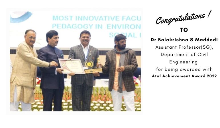 Dr Balakrishna Maddodi, Assistant Professor(SG), Department of Civil Engineering, was conferred with Atal Achievement Award 2022- "Most Innovative Faculty with excellent pedagogy in Environment Education and Social Impact".Dr Balakrishna Maddodi received the award from Syed Shahnawaz Hussain, Member of Parliament. A galaxy of ministers and people representatives were present on occasion. Udupi District Administration had also felicitated Dr Balakrishna Maddodi with UDUPI ZILLA RAJYOSTAVA AWARD 2021.
