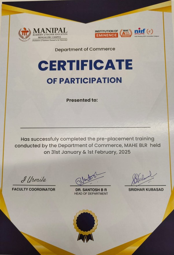 The Department of Commerce organized a comprehensive pre-placement training session that covered resume writing, mock interviews, group discussions, digital skills, corporate communication, and more. This session was designed to give students practical insights and prepare them for future placement activities.