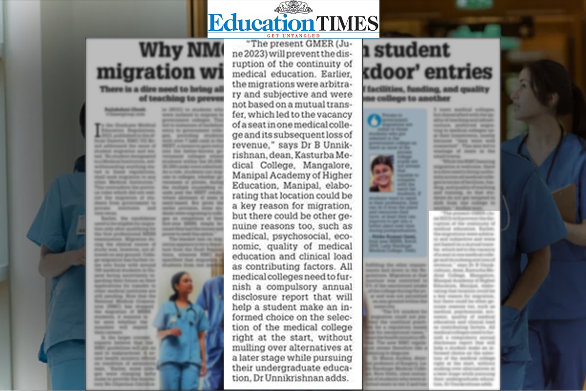 Manipal, 19 June 2023: In the article, “Why NMC regulation on student migration will control 'backdoor' entries”, valuable insights are given by Dr B. Unnikrishnan, Dean & Professor of Community Medicine, Kasturba Medical College (KMC), Mangalore.