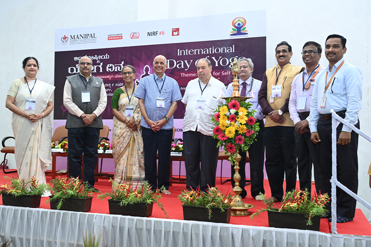 Following the yoga practice, a stage programme commenced at 9:00 AM at the same venue. The event was hosted by Dr. Lavya Shetty, Assistant Professor, and Dr. Divya Poojary, PG Student. Distinguished guests included Dr. HS Ballal, Pro Chancellor, MAHE; Dr. Sharath Kumar Rao, Pro Vice Chancellor, Faculty of Health Sciences; Shri T. Satish U. Pai, Executive Chairman, Manipal Media Network Ltd and Vice President, Academy of General Education; Dr. P. Giridhar Kini, Registrar, MAHE; Mrs. Indira Ballal, Philanthropist; and Dr. Satish Rao, Director Research, MAHE & Director, Manipal School of Life Sciences.