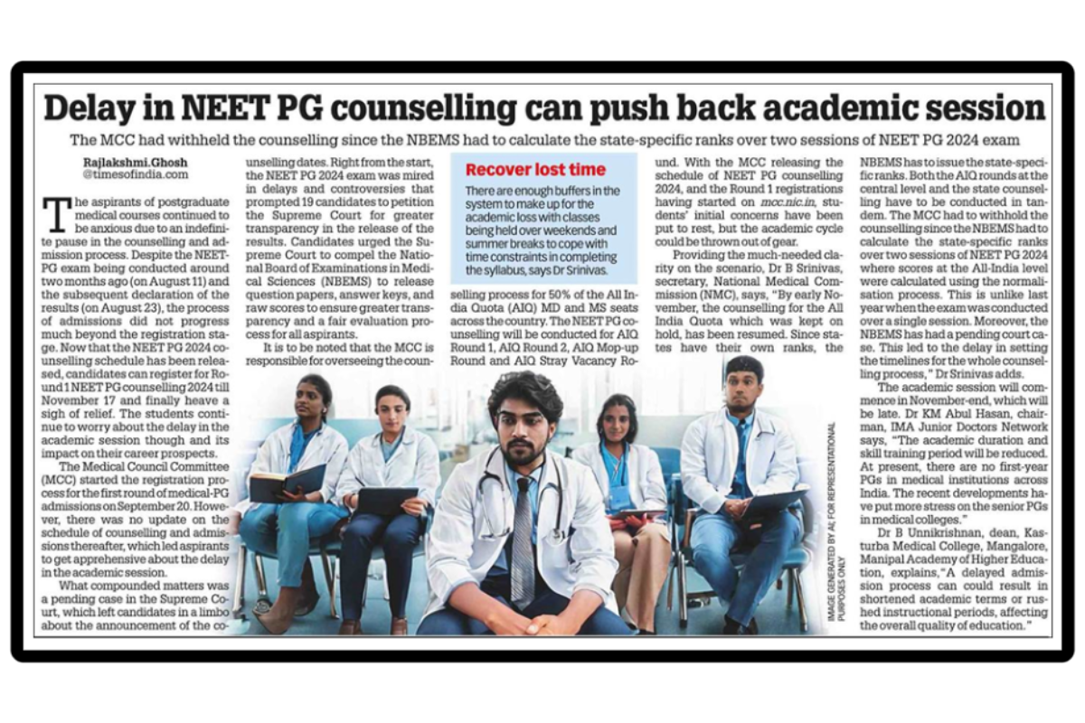 “Delay in NEET PG counselling can push back academic session”, valuable insights are given by Dr B. Unnikrishnan, Dean & Professor of Community Medicine, Kasturba Medical College (KMC), Mangalore.