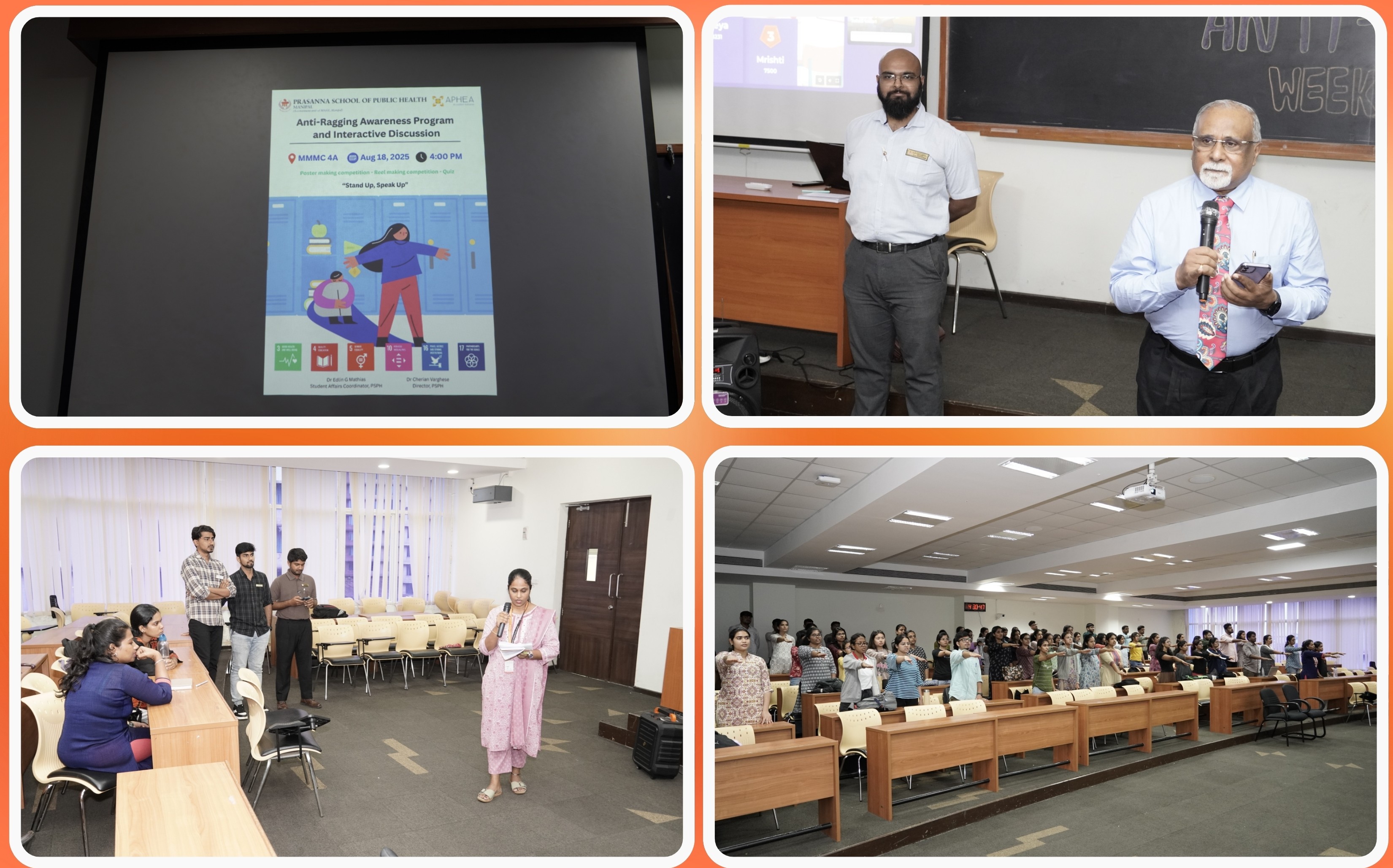 Prasanna School of Public Health (PSPH), Manipal Academy of Higher Education (MAHE), Manipal organised the “Anti-Ragging Awareness Program and Interactive Discussion” as part of Anti-Ragging Week 2025 on Monday, August 18, 2025 (16:00 to 17:00 hours IST) in the Lecture Hall 4A, MMMC Building, MAHE, Manipal. The following competitions were held during the occasion: