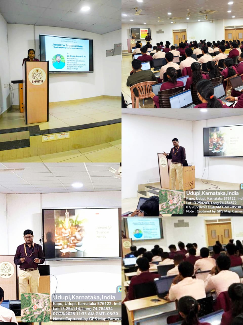 Dr Varun Kumar S G, Associate Professor, Department of Applied Statistics and Data Science, Prasanna School of Public Health, MAHE, Manipal, delivered an invited guest lecture and hands-on training on "Jamovi for Business Minds: Simplifying Analytics for Smarter Decisions" at SMVITM, Udupi on July 28, 2025. The session was organised by the Department of Business Administration and was attended by around 80 participants. Dr Varun Kumar S G, effectively engaged the audience through live demonstrations and gamification techniques, making the session highly interactive. Participants gained practical insights into statistical analysis using Jamovi, tailored for business application
