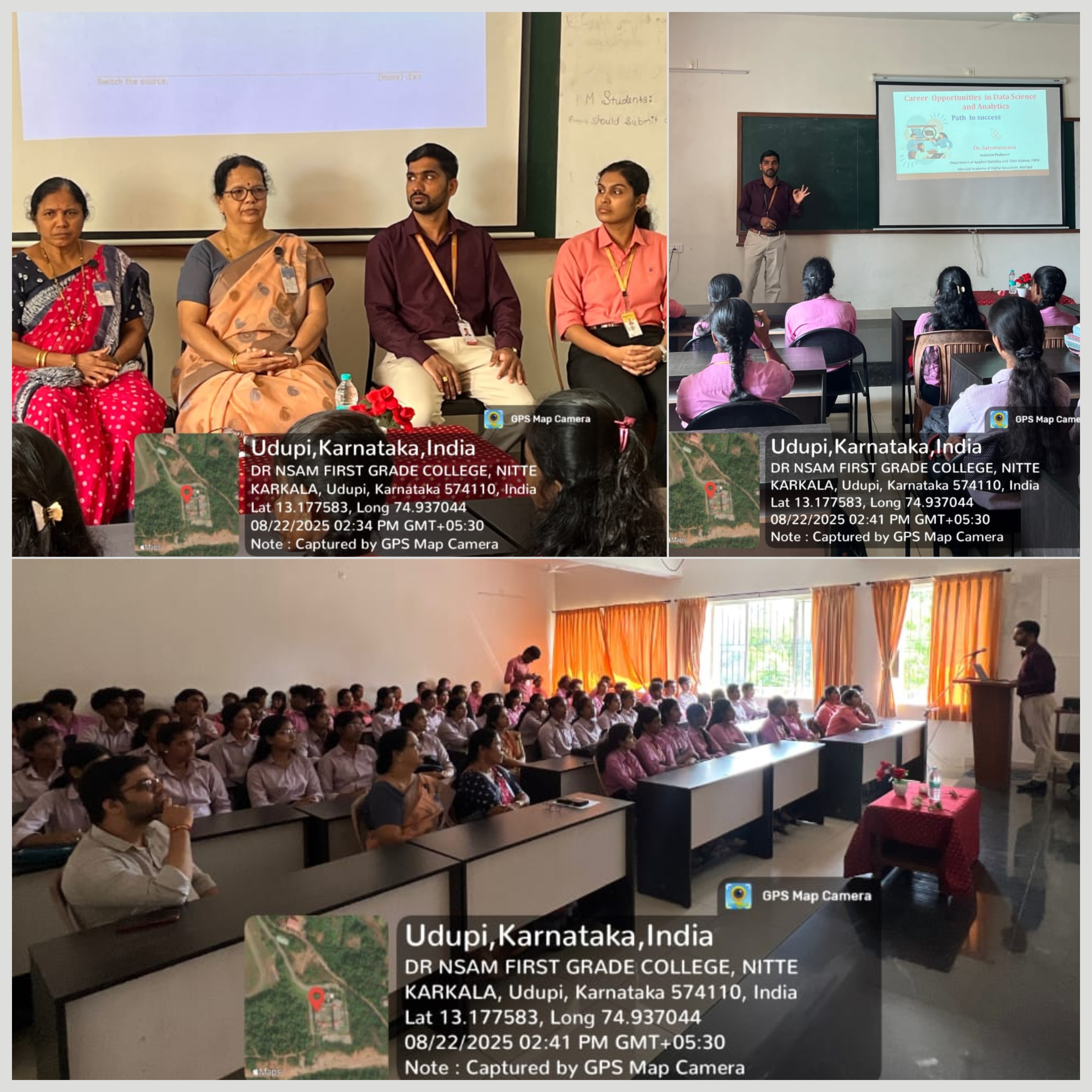 The Internal Quality Assurance Cell (IQAC), in association with the Science Association of Dr NSAM First Grade College, Nitte, organised a talk on “Career Opportunities in Data Science and Analytics” on August 22, 2025. The resource person was Dr Satyanarayana (Assistant Professor, Department of Applied Statistics and Data Science, Prasanna School of Public Health, Manipal Academy of Higher Education, Manipal). During the talk, Dr Satyanarayana emphasised the importance of strong foundations in statistics and computing, encouraging students to leverage their academic strengths to explore career opportunities in data science, machine learning, and analytics. Dr Satyanarayana also highlighted the emerging scope of data science and analytics across diverse sectors, underscoring the growing demand for skilled professionals. He motivated students to pursue higher education and explore opportunities in both research and industry.