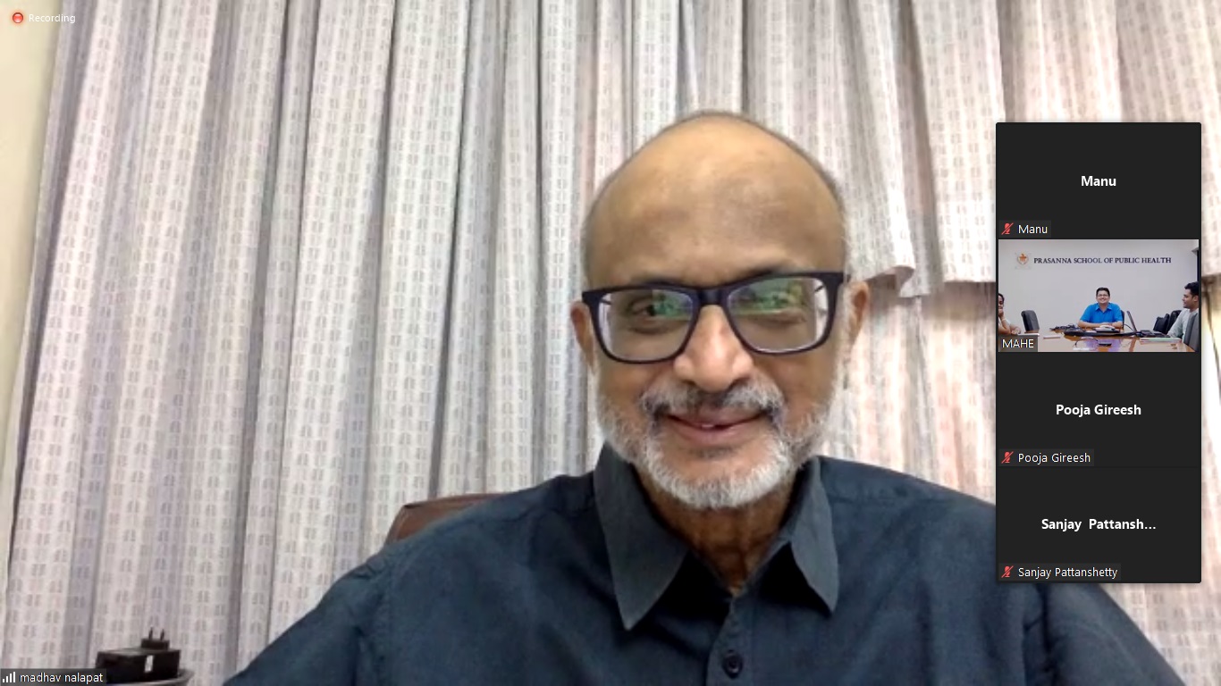 Prof Madhav Das Nalapat (UNESCO) Peace Chair, Department of Geopolitics and International Relations, Manipal Academy of Higher Education, Manipal, spoke about 'Expanding the Concept of Climate Change in a World of Changing Realities' at Prof Rajani Prasanna Endowment Lecture Series on Climate Change and its Impact on Public Health – Lecture III on Wednesday, June 15, 2022, organised by Prasanna School of Public Health. Dr Rajesh Kamath, Faculty, MHA Programme moderated the programme.