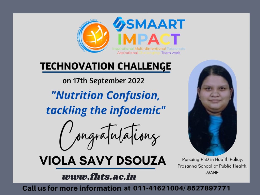 Ms Viola Savy Dsouza, PhD scholar at the Department of Health Policy, PSPH, MAHE won the First Prize in the Technovation Challenge of the third SMAART IMPACT Hackathon, for her idea on "Nutrition Confusion, Tackling the Infodemic". the event was organized by Foundation of Healthcare Technologies Society (FHTS), New Delhi.