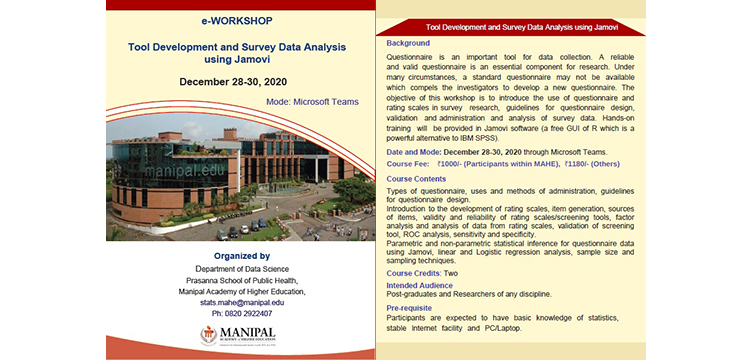 Department of Data Science, Prasanna School of Public Health is organizing an e-Workshop on "Tool Development and Survey Data Analysis using Jamovi" during December 28-30, 2020. This three-day e-Workshop will introduce statistical concepts associated with design and analysis of questionnaire and survey data with hands-on activities using JAMOVI: A well-known Graphical User Interface Software built on R. For more details, please find the enclosed brochure.