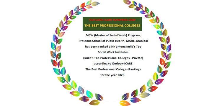 MSW (Master of Social Work) Program at Prasanna School of Public Health (PSPH), MAHE, Manipal has been ranked 14th among India's Top Social Work Institutes (India's Top Professional Colleges - Private) according to Outlook - ICARE The Best Professional Colleges Rankings for the Year 2020.