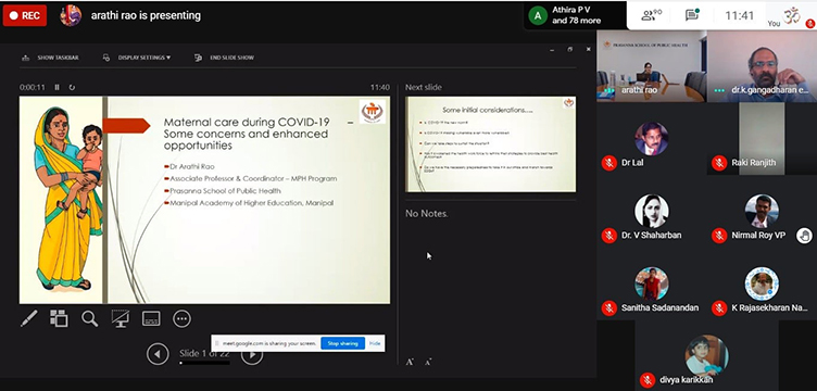 Dr Arathi Rao (Coordinator, MPH Program) during her invited talk on persons "Maternal Care during COVID-19: Some Concerns and Enhanced Opportunities" at the National Webinar on COVID-19 Pandemic and Public Healthcare Concerns in India organized by the Department of Economics, Kannur University through Google Meet on November 30, 2020.
