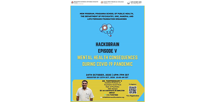 MSW Program - Department of Global Health - Prasanna School of Public Health, The Department of Psychiatry- Kasturba Medical College and Life Forward Foundation are jointly organizing  ‘Hackobrain – Episode 5 – Mental Health Consequences during COVID-19 Pandemic’ during 18:00 - 19:00 hours IST of October 24, 2020. Dr. Thippeswamy V  (Assistant Professor of Psychiatric Social Work, Department of Psychiatry, KMC, Manipal) is the resource person for the webinar.