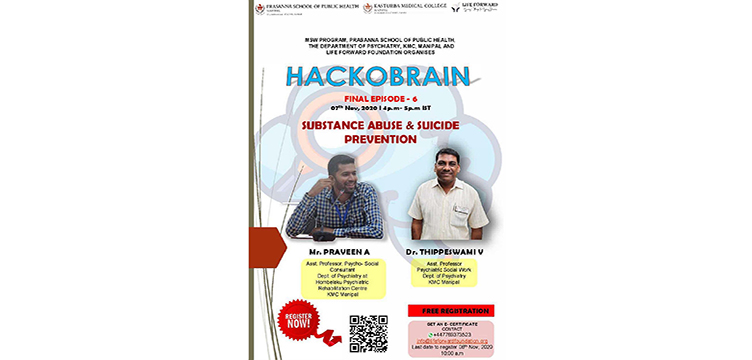 MSW Program, Department of Global Health together with The Department of Psychiatry, Kasturba Medical College (KMC), Manipal and Life Forward Foundation are jointly organizing ‘Hackobrain – Final Episode 6 – Substance Abuse and Suicide Prevention’ on November 7, 2020 (16:00 - 17:00 hours IST). Mr Praveen A (Assistant Professor, Psycho-Social Consultant, Department of Psychiatry at Hombelaku Psychiatric Rehabilitation Centre, KMC) and Dr Thippeswami V (Assistant Professor, Department of Psychiatry, KMC) will be the resource persons for this webinar.