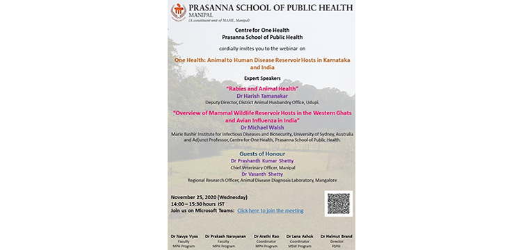Centre for One Health organized a webinar on ‘One Health: Animal to Human Disease Reservoir Hosts in Karnataka and India’ on November 25, 2020 (14:00 to 15:30 hrs IST)