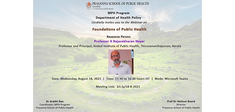 MPH Program, Department of Health Policy, PSPH organized a webinar on “Foundations of Public Health” through Microsoft Teams on Wednesday, August 18, 2021 (15:30 to 16:30 hours IST). Prof. K Rajasekharan Nayar (Professor and Principal, Global Institute of Public Health, Thiruvananthapuram, Kerala) was the resource person for this event.