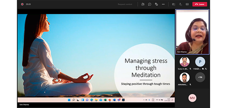 MHA Program, PSPH in association with Academy of Hospital Administration, Manipal Chapter and Darshan Education Foundation, New Delhi organized a webinar on “Managing Stress Through Meditation” on November 23, 2021. Ms Simi Sharma (Founder Director, Avalon Heights International School, Mumbai) was the resource person for this event.